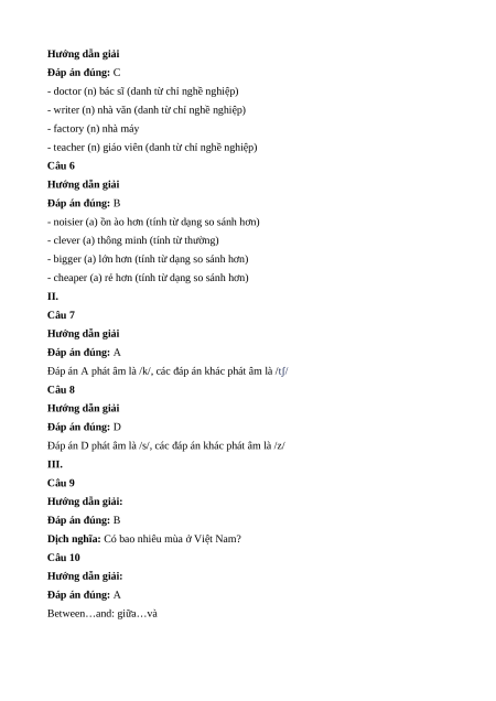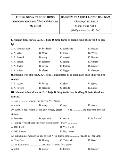 I. Khoanh tròn chữ cái A, B, C hoặc D đứng trước từ không cùng nhóm với 3 từ còn lại. 1. A. stomach ache B. headache C. toothache D. doctor 2. A. Who B. What C. there D. When 3. A. danced B. song C. stayed D. listened 4. A. season B. summer C. spring D. winter 5. A. doctor B. writer C. factory D. teacher 6. A. noiser B. clever C. bigger D. cheaper