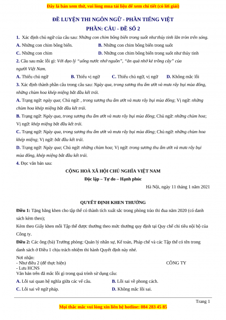 ĐỀ LUYỆN THI NGÔN NGỮ - PHẦN TIẾNG VIỆT