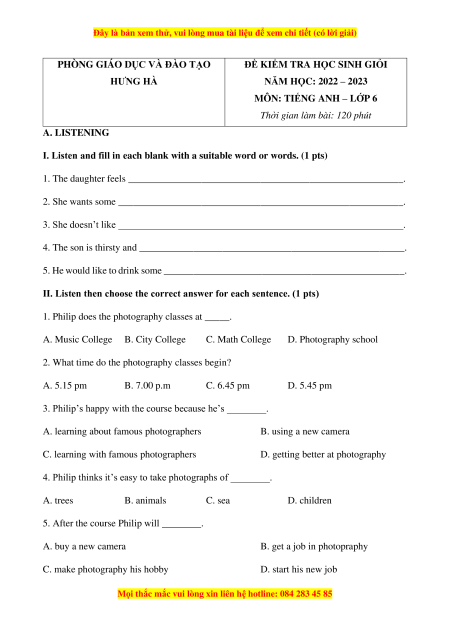 Đề luyện thi HSG Tiếng Anh 6 | Đề thi học sinh giỏi Anh 6