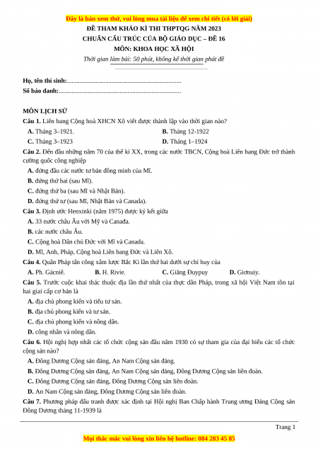 Số báo danh:............................................................................ MÔN LỊCH SỬ