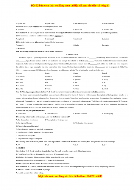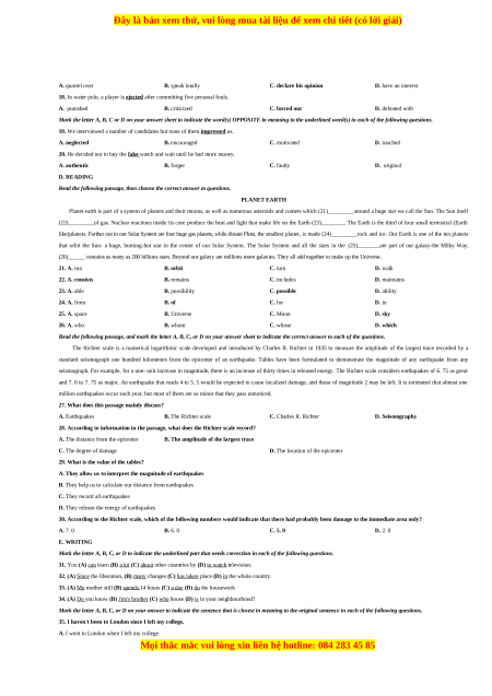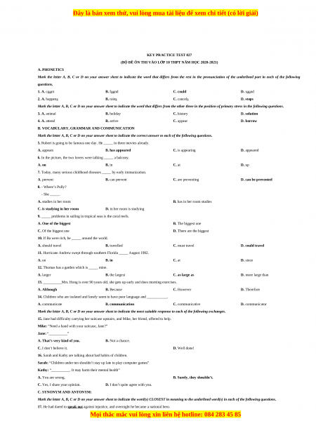 (BỘ ĐỀ ÔN THI VÀO LỚP 10 THPT NĂM HỌC 2020-2021) A. PHONETICS