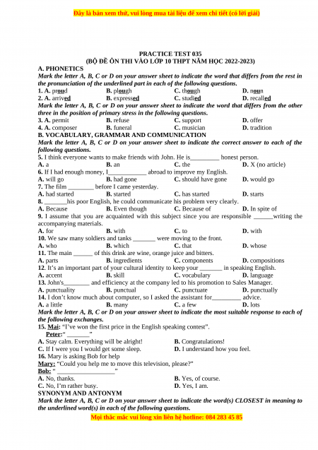 (BỘ ĐỀ ÔN THI VÀO LỚP 10 THPT NĂM HỌC 2022-2023) A. PHONETICS