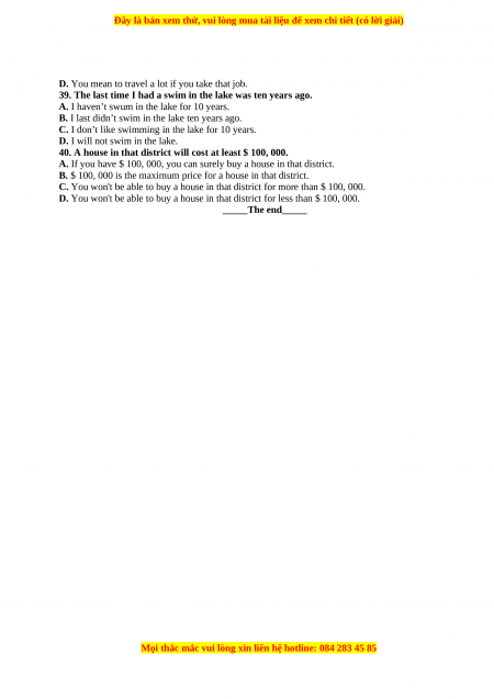 ang: “ Thank for your help, Lan:” - Lan : “ ______” A. with all my heart B. Never remind me C. It’s my pleasure D. Wish you C. SYNONYM AND ANTONYM: