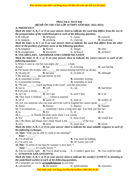 (BỘ ĐỀ ÔN THI VÀO LỚP 10 THPT NĂM HỌC 2022-2023) A. PHONETICS