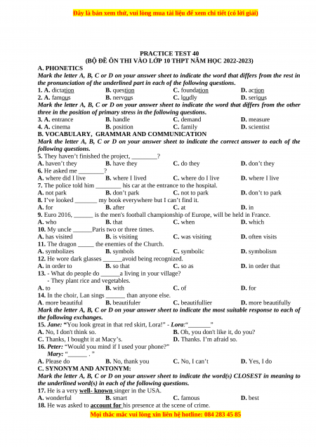 (BỘ ĐỀ ÔN THI VÀO LỚP 10 THPT NĂM HỌC 2022-2023) A. PHONETICS