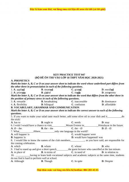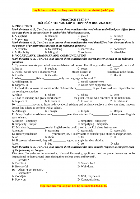 (BỘ ĐỀ ÔN THI VÀO LỚP 10 THPT NĂM HỌC 2022-2023) A. PHONETICS
