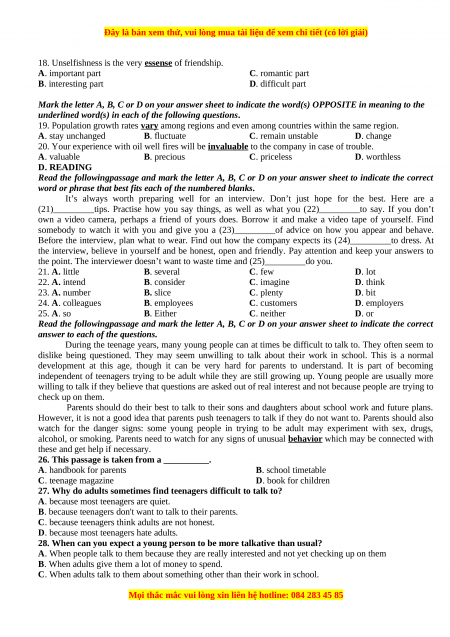 18. Unselfishness is the very essense of friendship. A. important part C. romantic part B. interesting part D. difficult part