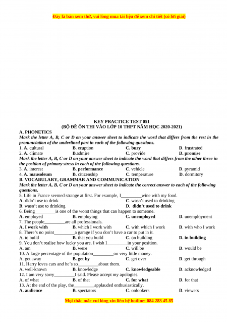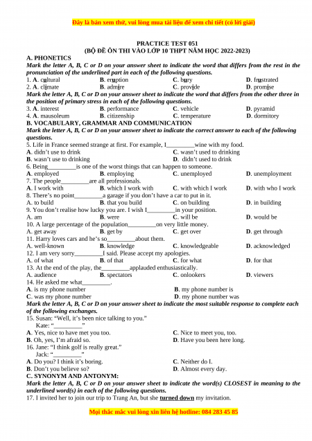 (BỘ ĐỀ ÔN THI VÀO LỚP 10 THPT NĂM HỌC 2022-2023) A. PHONETICS