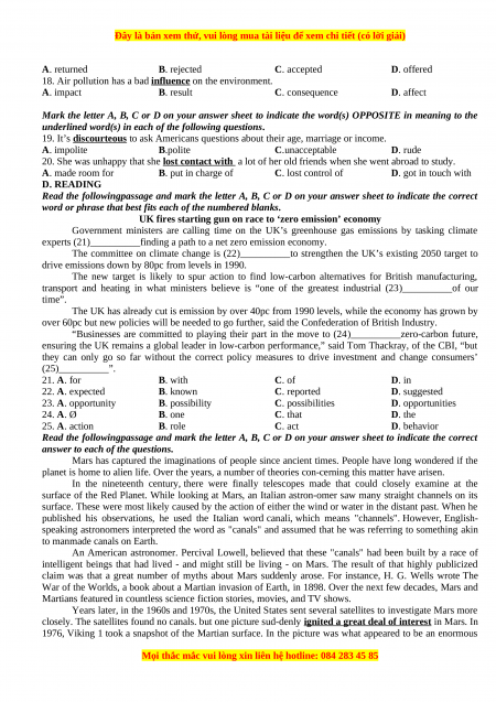 they can only go so far without the correct policy measures to drive investment and change consumers’ (25)__________”. 21. A. for B. with C. of D. in 22. A. expected B. known C. reported D. suggested 23. A. opportunity B. possibility C. possibilities D. opportunities 24. A. Ø B. one C. that D. the 25. A. action B. role C. act D. behavior