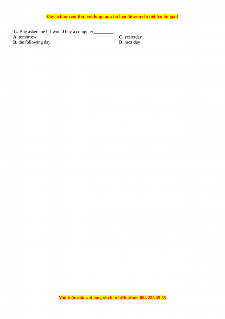 14. She asked me if I would buy a computer_________. A. tomorrow C. yesterday B. the following day D. next day