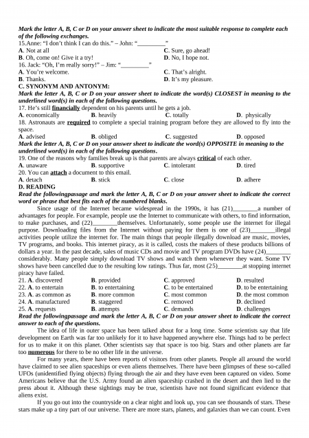 16. Jack: “Oh, I’m really sorry!” – Jim: “_________” A. You’re welcome. C. That’s alright. B. Thanks. D. It’s my pleasure. C. SYNONYM AND ANTONYM: