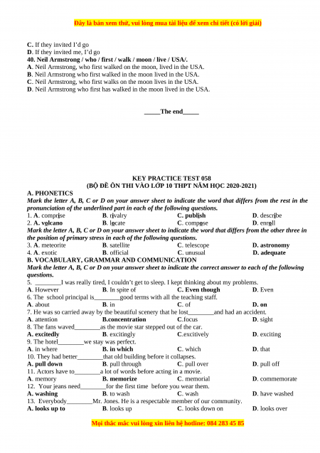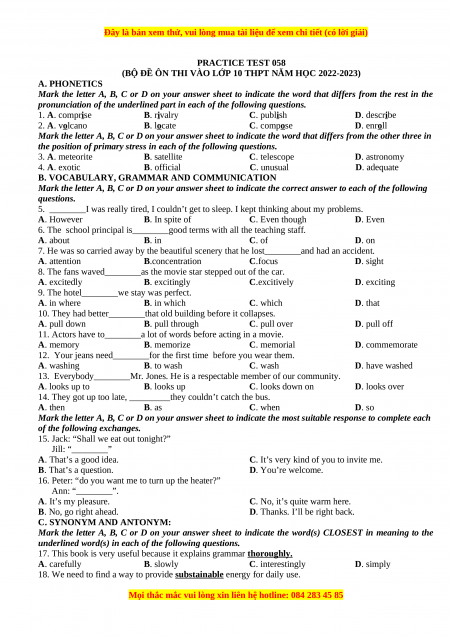 (BỘ ĐỀ ÔN THI VÀO LỚP 10 THPT NĂM HỌC 2022-2023) A. PHONETICS