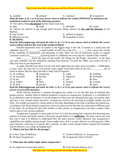 20. Drivers are advised to get enough petrol because filling stations are few and far between on the highway. A. easy to find C. unlikely to happen B. difficult to access D. impossible to reach D. READING