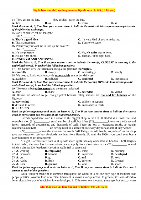 D. Thanks. I’ll be right back. C. SYNONYM AND ANTONYM:
