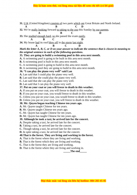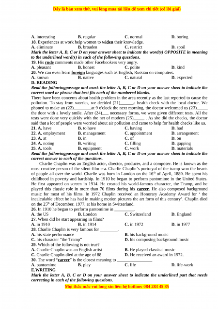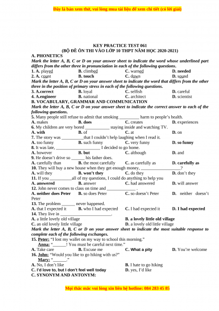 (BỘ ĐỀ ÔN THI VÀO LỚP 10 THPT NĂM HỌC 2020-2021) A. PHONETICS