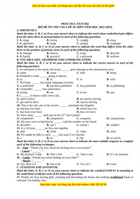(BỘ ĐỀ ÔN THI VÀO LỚP 10 THPT NĂM HỌC 2022-2023) A. PHONETICS