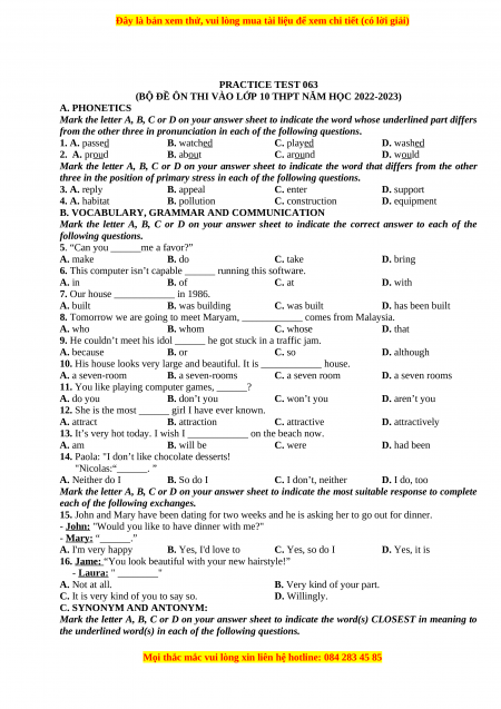 (BỘ ĐỀ ÔN THI VÀO LỚP 10 THPT NĂM HỌC 2022-2023) A. PHONETICS