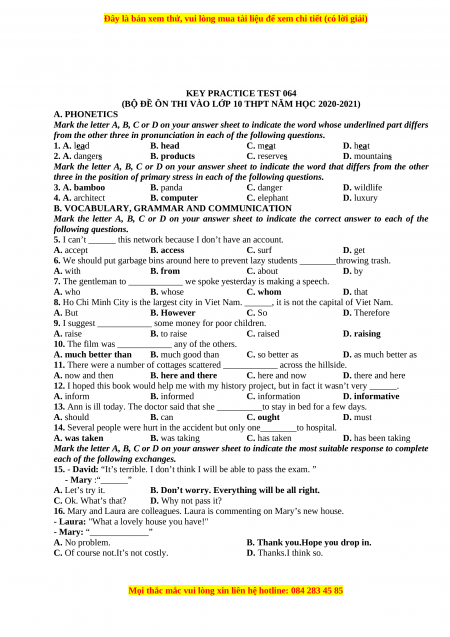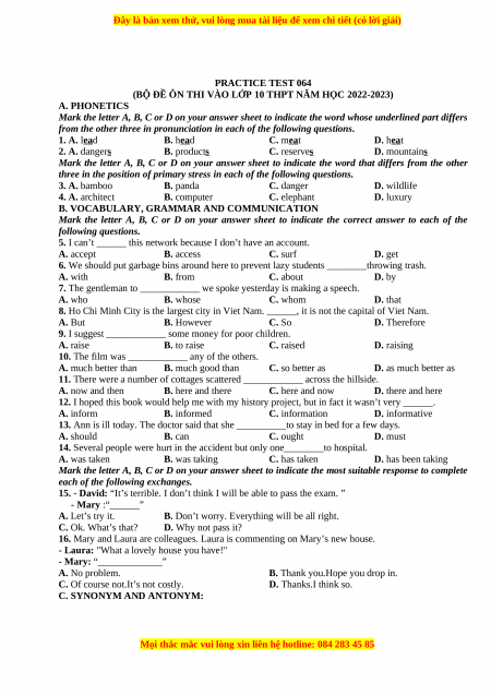 (BỘ ĐỀ ÔN THI VÀO LỚP 10 THPT NĂM HỌC 2022-2023) A. PHONETICS