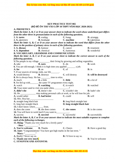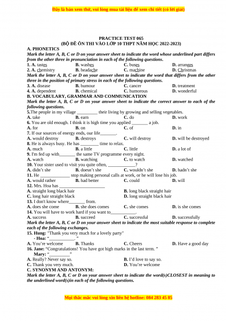 (BỘ ĐỀ ÔN THI VÀO LỚP 10 THPT NĂM HỌC 2022-2023) A. PHONETICS