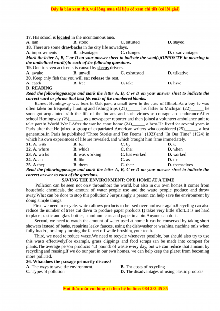 - Hoa: “___________. ” A. You’re welcome B. Thanks C. Cheers D. Have a good day