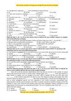 organizations has been spent on maintaining the parks. The use of products made from (28) _________ species has been stopped. 25. A. whose B. which C. that D. who 26. A. population B. amount C. quantity D. diversity 27. A. for B.therefore C. because D. so 28. A.dangerous B. danger C. endangered D. endanger