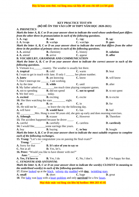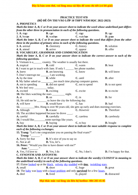 (BỘ ĐỀ ÔN THI VÀO LỚP 10 THPT NĂM HỌC 2022-2023) A. PHONETICS