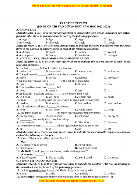 (BỘ ĐỀ ÔN THI VÀO LỚP 10 THPT NĂM HỌC 2022-2023) A. PHONETICS