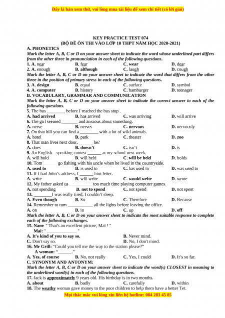 (BỘ ĐỀ ÔN THI VÀO LỚP 10 THPT NĂM HỌC 2020-2021) A. PHONETICS