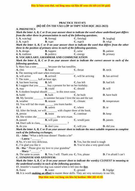 (BỘ ĐỀ ÔN THI VÀO LỚP 10 THPT NĂM HỌC 2022-2023) A. PHONETICS