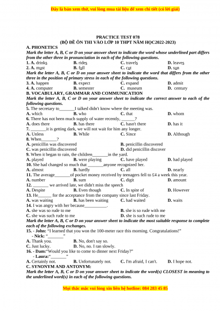 (BỘ ĐỀ ÔN THI VÀO LỚP 10 THPT NĂM HỌC2022-2023) A. PHONETICS