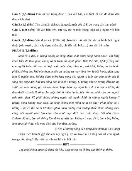 Câu 4. (1,0 điểm) Từ văn bản trên, em hãy rút ra một thông điệp có ý nghĩa với bản thân.