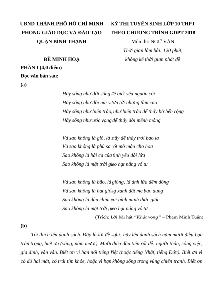 Đề minh họa thi vào lớp 10 Ngữ văn 2025 - Phòng GD Bình Thạnh