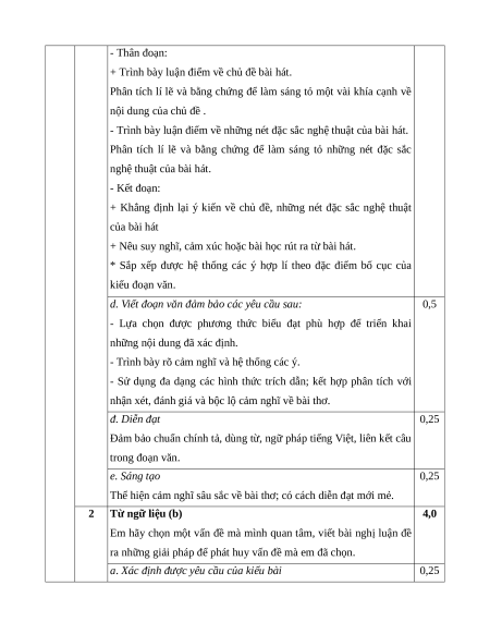 * Học sinh có thể diễn đạt theo nhiều cách khác nhau, miễn sao hợp lí. II VIẾT 6,0 1 Từ ngữ liệu (a) 2,0