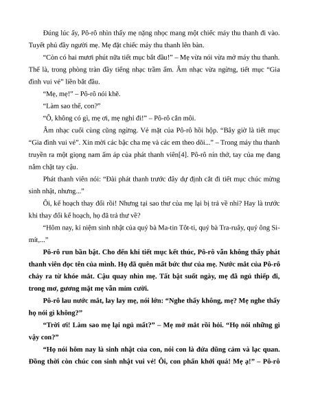 truyền ra một giọng nam ấm áp của phát thanh viên[4]. Pô-rô nín thở, tay của mẹ đang nắm chặt tay cậu.