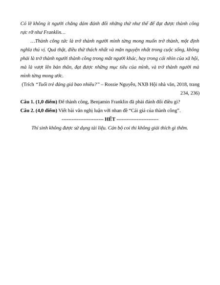 Câu 2. (4,0 điểm) Viết bài văn nghị luận với nhan đề “Cái giá của thành công”.