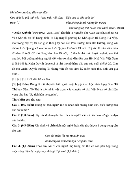 không kể thời gian phát đề PHẦN I (5,0 điểm) Đọc văn bản sau: LỜI RU Xuân Quỳnh(*)