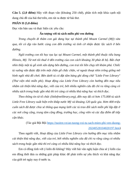Câu 5. (2,0 điểm) Hãy viết đoạn văn (khoảng 250 chữ), phân tích một khía cạnh nội