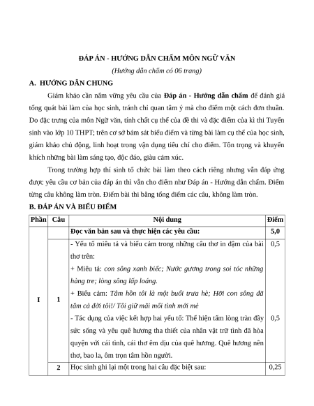 ĐÁP ÁN - HƯỚNG DẪN CHẤM MÔN NGỮ VĂN