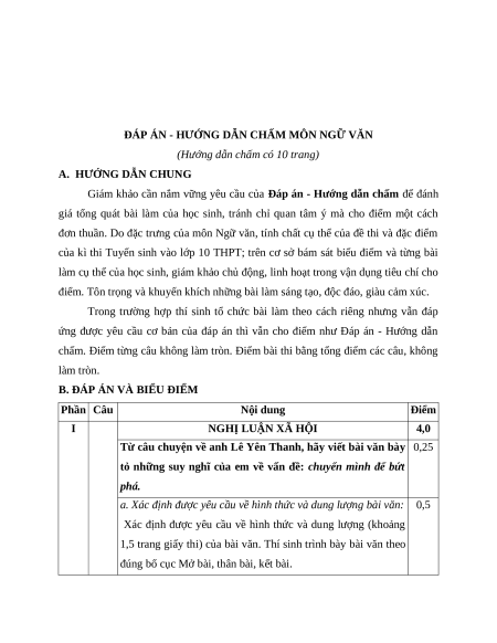 ĐÁP ÁN - HƯỚNG DẪN CHẤM MÔN NGỮ VĂN