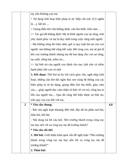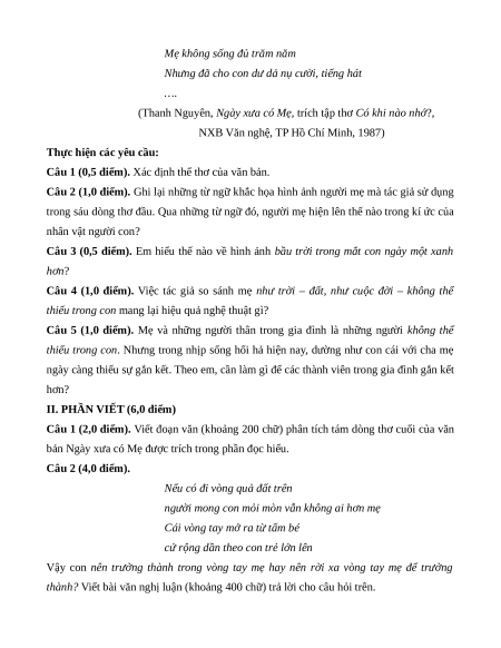 bản Ngày xưa có Mẹ được trích trong phần đọc hiểu. Câu 2 (4,0 điểm).