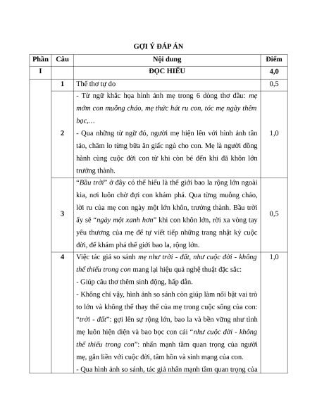 thành? Viết bài văn nghị luận (khoảng 400 chữ) trả lời cho câu hỏi trên. GỢI Ý ĐÁP ÁN Phần Câu Nội dung Điểm I ĐỌC HIỂU 4,0 1 Thể thơ tự do 0,5