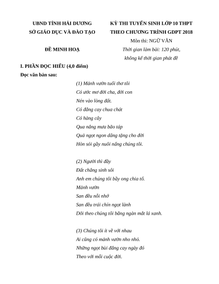 Đề minh họa thi vào lớp 10 Ngữ văn 2025 - Sở GD Hải Dương