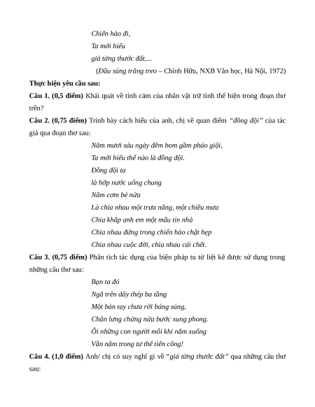 Câu 4. (1,0 điểm) Anh/ chị có suy nghĩ gì về “giá từng thước đất” qua những câu thơ sau: Khi bạn ta lấy thân mình đo bước Chiến hào đi, Ta mới hiểu