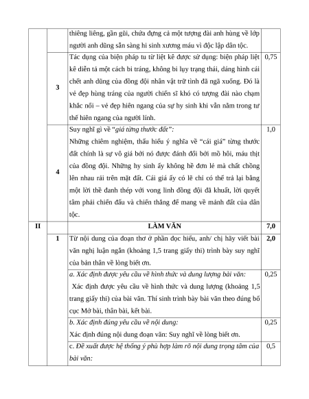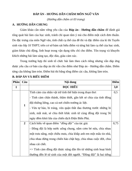 ĐÁP ÁN - HƯỚNG DẪN CHẤM MÔN NGỮ VĂN