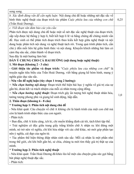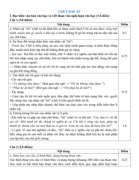 I. Đọc hiểu văn bản văn học và viết đoạn văn nghị luận văn học (5,0 điểm) Câu 1 (3,0 điểm): Nội dung Điểm