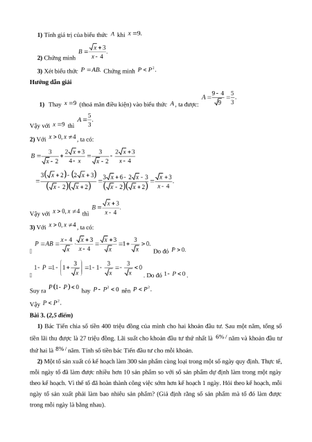 1) Bác Tiến chia số tiền 400 triệu đồng của mình cho hai khoản đầu tư. Sau một năm, tổng số