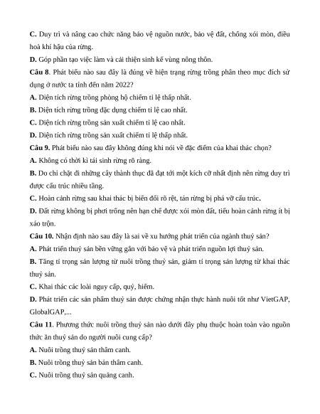 Câu 7. Phát biểu nào sau đây không đúng về ý nghĩa của bảo vệ và khai thác tài nguyên rừng bền vững?