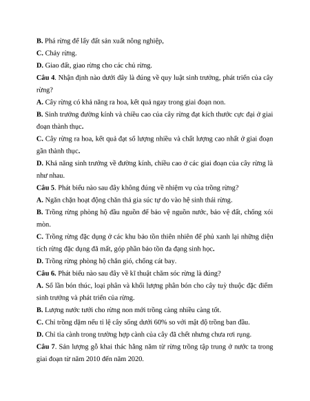 Câu 4. Nhận định nào dưới đây là đúng về quy luật sinh trưởng, phát triển của cây rừng?