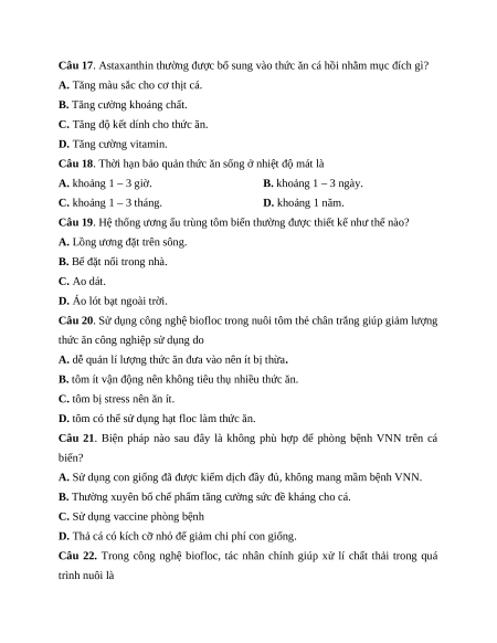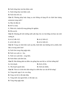 Câu 10. Loại thuỷ sản nào sau đây sinh trưởng tốt trong điều kiện nhiệt độ ấm áp? A. Cá tầm. B. Cả hồi vân. C. Cua tuyết. D. Tôm càng xanh.