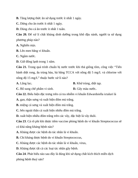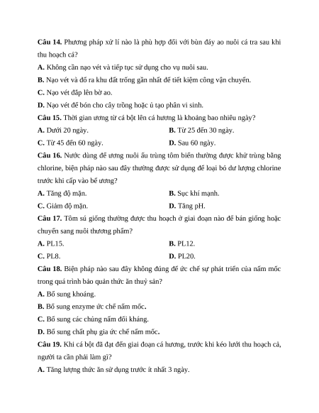 Câu 19. Khi cá bột đã đạt đến giai đoạn cá hương, trước khi kéo lưới thu hoạch cả,